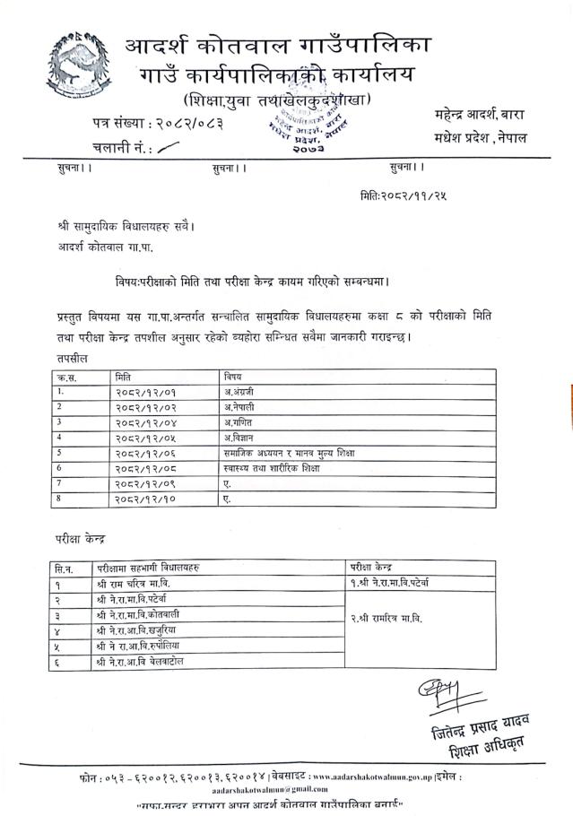 » कक्षा ८ को परीक्षा मिति तथा परीक्षा केन्द्र कायम गरिएको सम्बन्धमा । श्री सामुदायिक विद्यालयहरु सबै, श्री विद्यार्थीहरु सबै - आदर्श कोतवाल