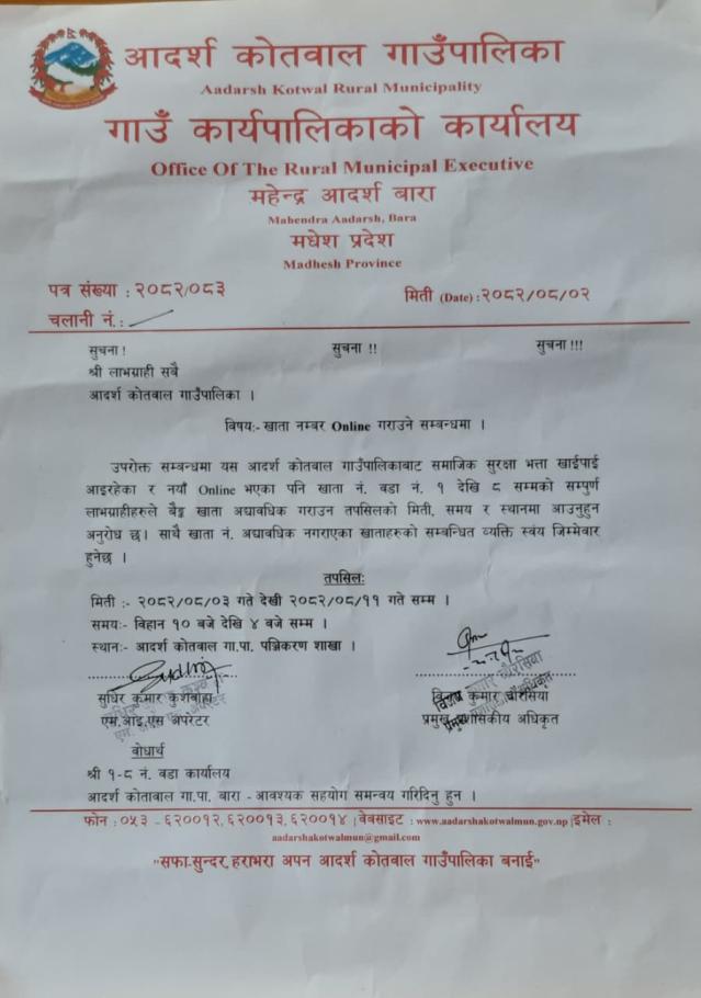 » खाता नम्बर अनलाईन गराउने सम्बन्धमा । श्री लाभग्राहीहरु सबै, श्री वडा कार्यालयहरु सबै, आदर्श कोतवाल