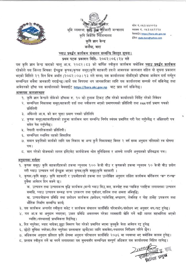 च्याउ प्रवर्द्धन कार्यक्रम संचालन सम्बन्धि कृषि ज्ञान केन्द्र, कलैया, बाराको विस्तृत सूचना। प्रथम पटक प्रकाशन मितिः २०८२।०६।२४ गते