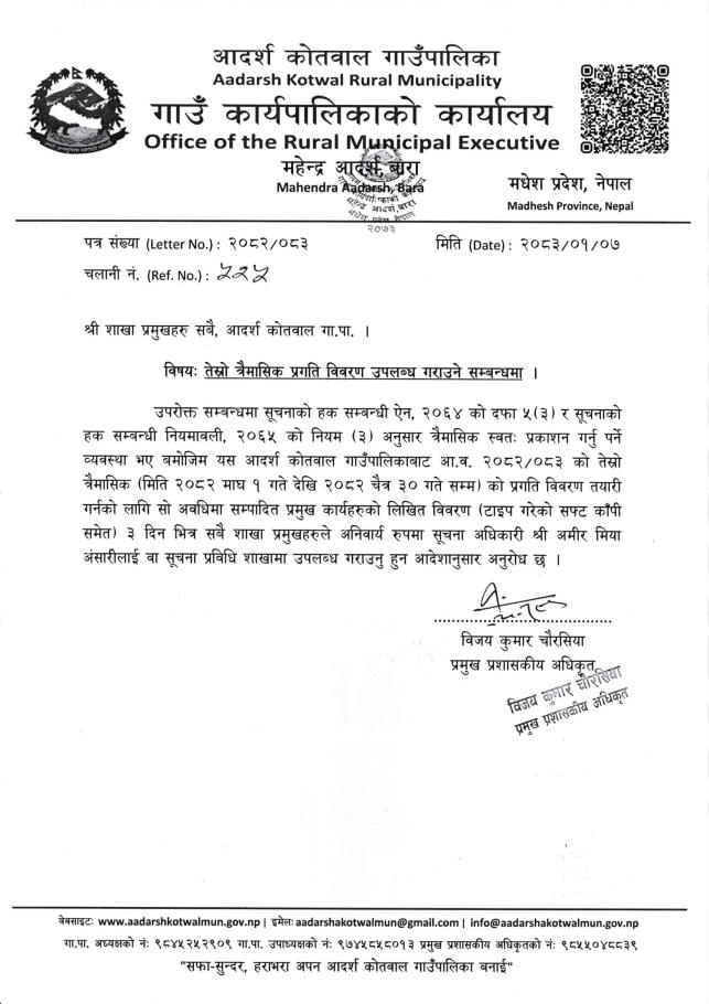 » तेस्रो त्रैमासिक प्रगति विवरण उपलब्ध गराउने सम्बन्धमा । श्री शाखा प्रमुखहरु सबै - आदर्श कोतवाल गापा