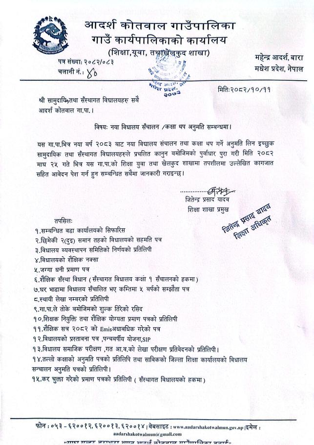 नयाँ विद्यालय संचालन/कक्षा थप अनुमति सम्बन्धमा । श्री सामुदायिक तथा संस्थागत विद्यालयहरु सबै, आदर्श कोतवाल