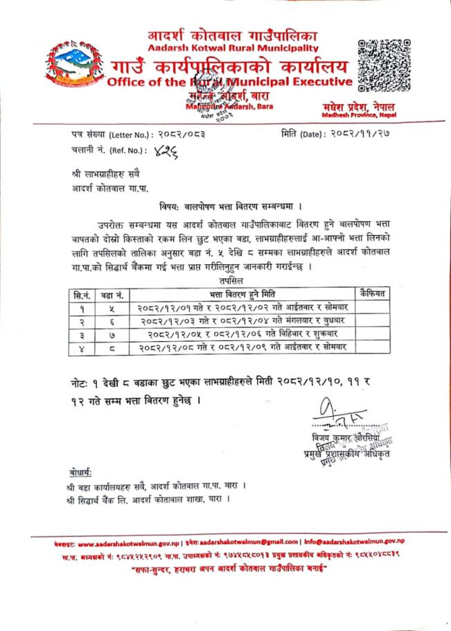» बालपोषण भता वितरण सम्बन्धमा । श्री वडा कार्यालयहरु सबै, श्री लाभग्राहीहरु सबै, आदर्श कोतवाल