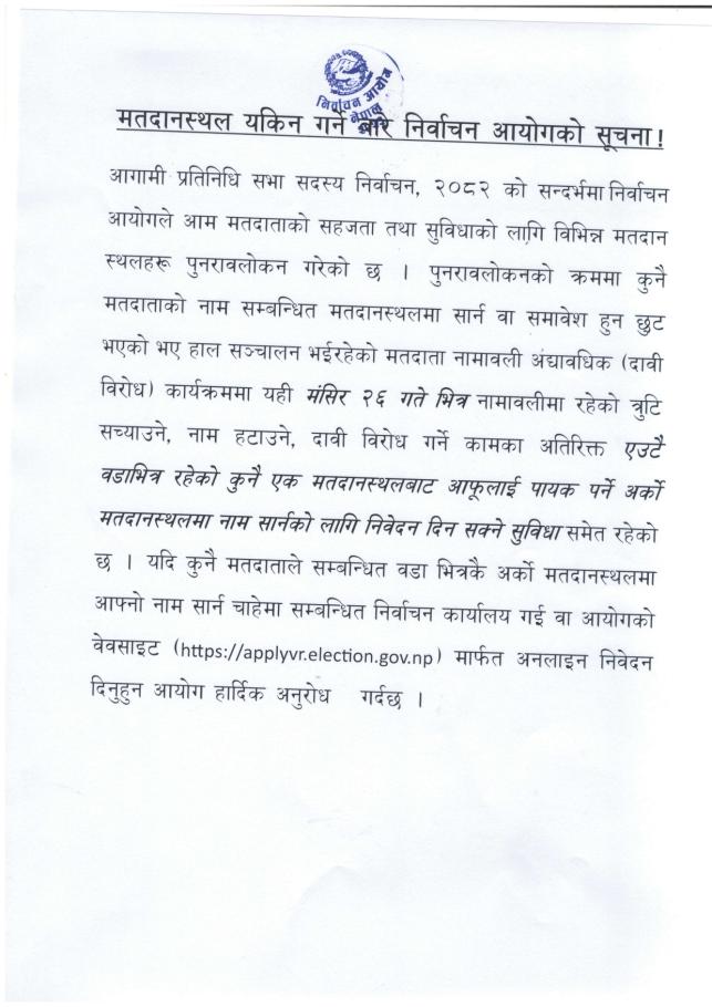 मतदान स्थल यकिन गर्ने बारे निर्वाचन आयोगको सूचना । श्री सम्बन्धित सबै