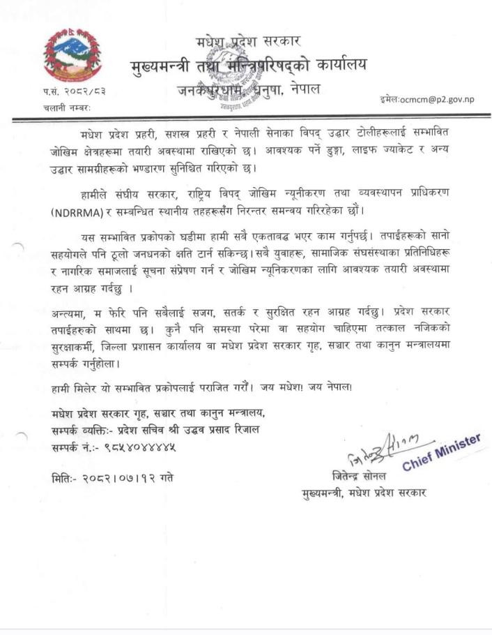 मधेश प्रदेश सरकारको अपिल तथा सतर्कता अपनाउने सम्बन्धमा ।