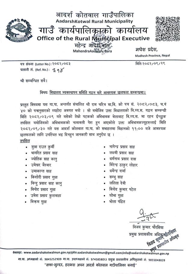» विद्यालय व्यवस्थापन समिति गठन बारे आवश्यक छलफल सम्बन्धमा । श्री सम्बन्धित सबै