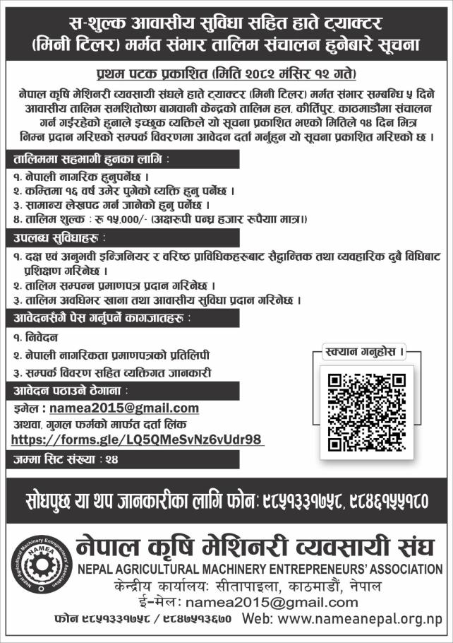 स-शुल्क आवासीय सुविधा सहित हाते टयाक्टर (मिनी टिलर) मर्मत संभार तालिम संचालन हुने बारे सूचनाको जानकारी गराइएको सम्बन्धमा । श्री सरोकारवाला सबै