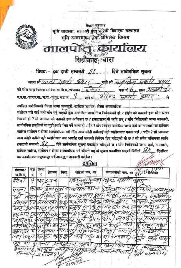 हक दाबी सम्बन्धी मालपोत कार्यालय, सिम्रौनगढ, बाराको ३५ दिने सार्वजनिक सूचना । श्री सम्बन्धित सबै - सूचना मितिः २०८२/११/१२ गते