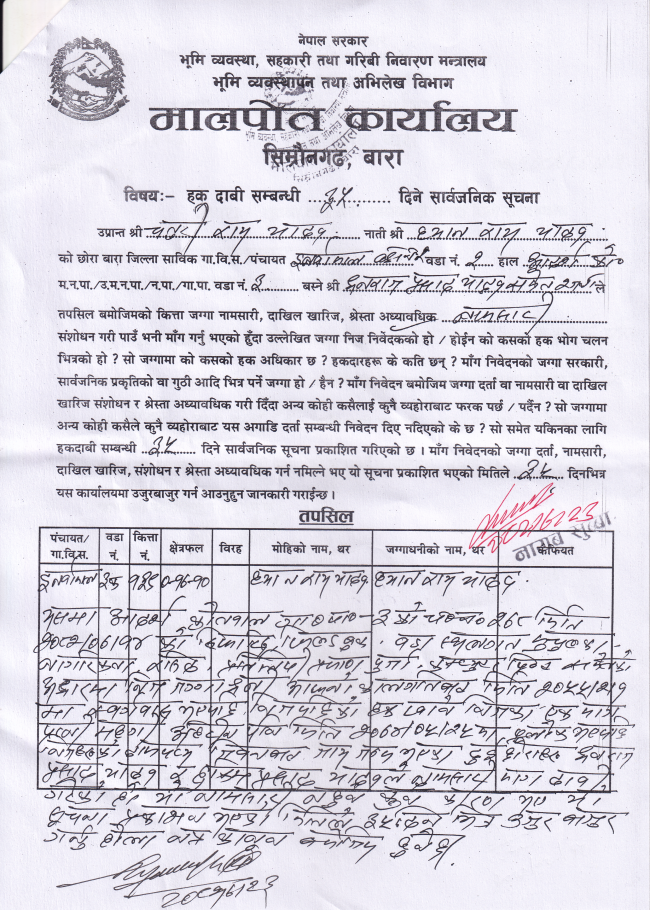 हक दाबी सम्बन्धी मालपोत कार्यालय, सिम्रौनगढ, बाराको ३५ दिने सार्वजनिक सूचना । सूचना मिति २०८२/०७/२३ गते