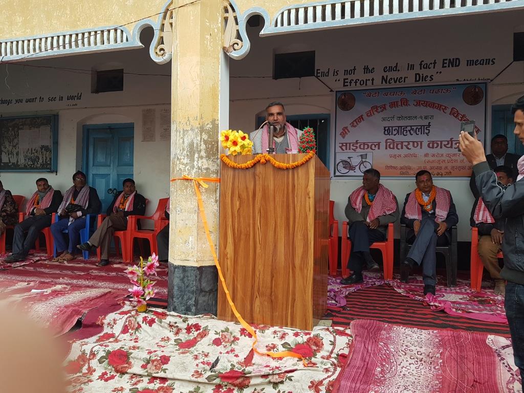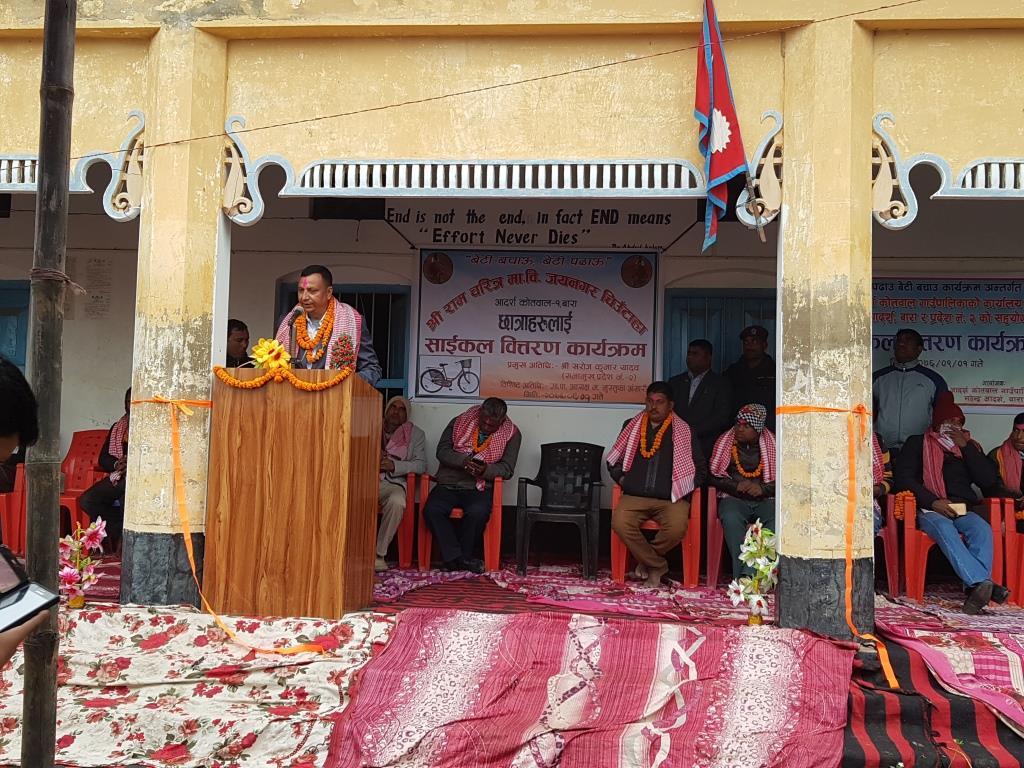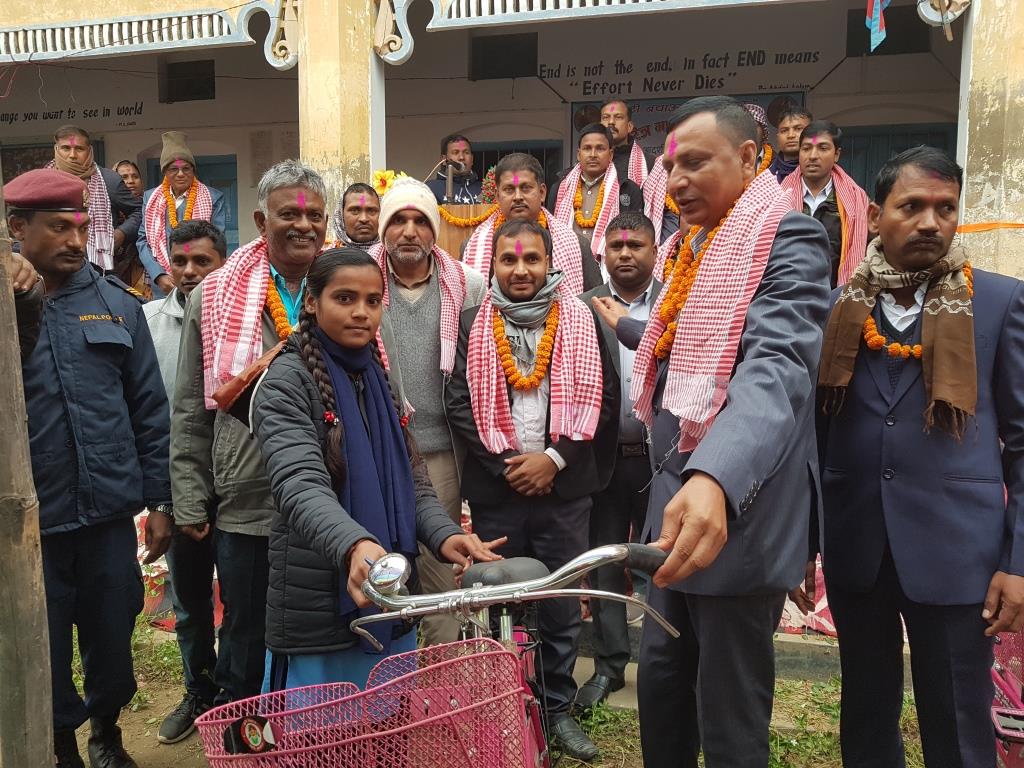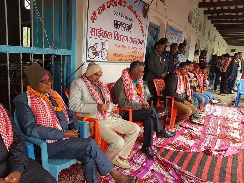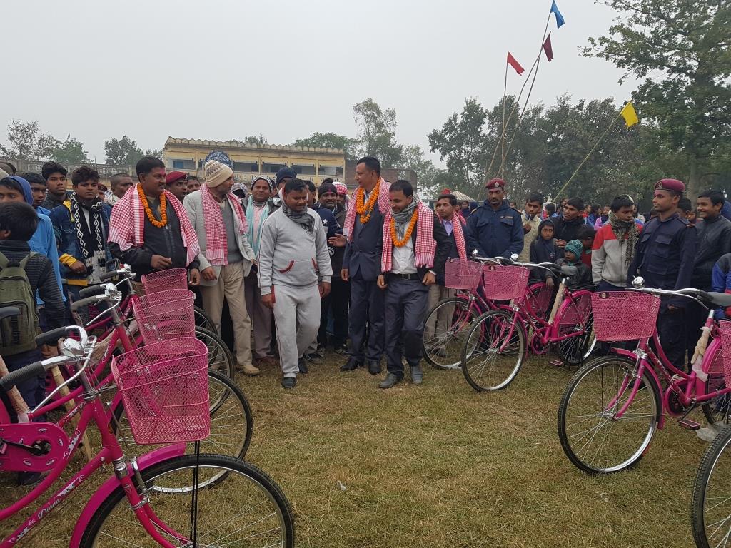आज मिति २०७६ पौष १ गते यस गाउँपालिका अन्तर्गतका सामुदायिक विद्यालयहरुमा कक्षा ७ र ८ मा अध्ययनरत छात्राहरुलाई मुख्यमंत्री बेटी पढाउँ, बेटी बचाउँ कार्यक्रम अभियानमा प्रदेश नं. २ बाट १३३ थान र यस आदर्श कोतवाल गाउँपालिका बाट २१० थान गरि जम्मा ३४३ थान लेडिज साइकल वितरण गरियो । यस कार्यक्रमका प्रमुख अतिथिको रुपमा प्रदेश २ का सभामुख श्री सरोज कुमार यादवज्यु तथा यस कार्यक्रमको अध्यक्षतामा यस गाउँपालिकाका अध्यक्ष श्री मुस्तुफा अंसारीज्यु रहनु भएको थियो ।