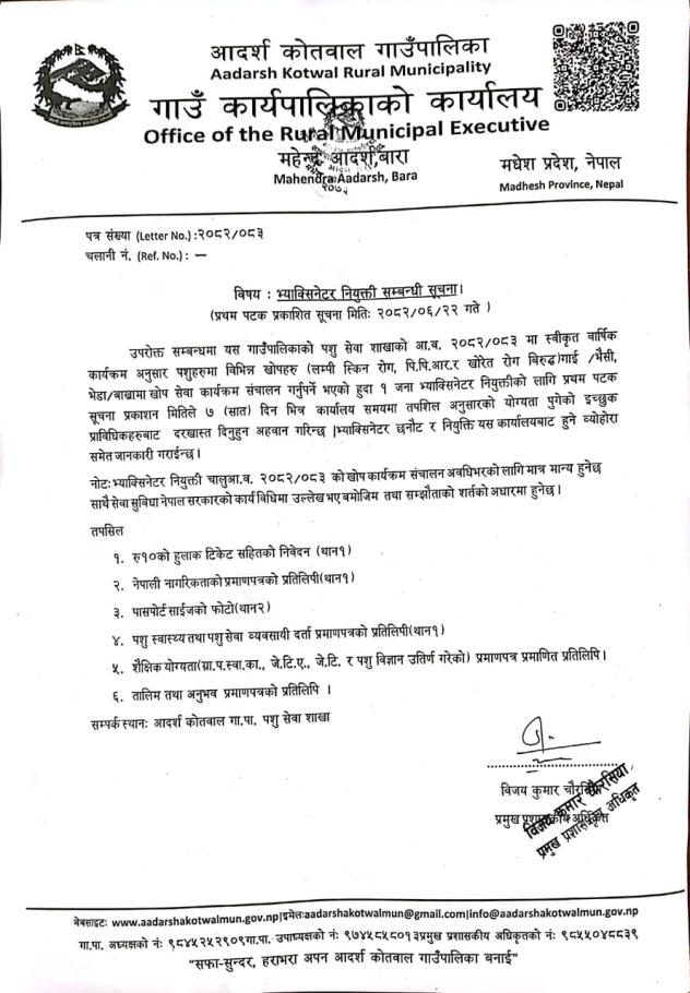 » भ्याक्सिनेटर नियुक्ती सम्बन्धी सूचना । प्रथम पटक प्रकाशित मिति २०८२/०६/२२ गते