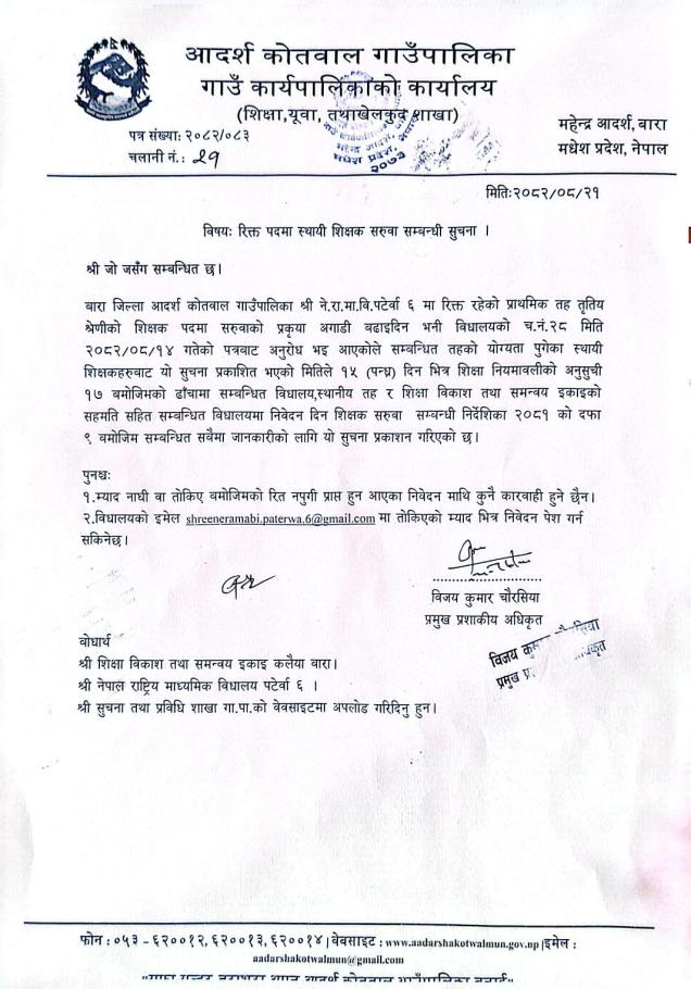 » रिक्त पदमा स्थायी शिक्षक सरुवा सम्बन्धी १५ दिने सूचना । श्री सम्बन्धित सबै (प्रकाशित मितिः २०८२/०८/२१ गते)