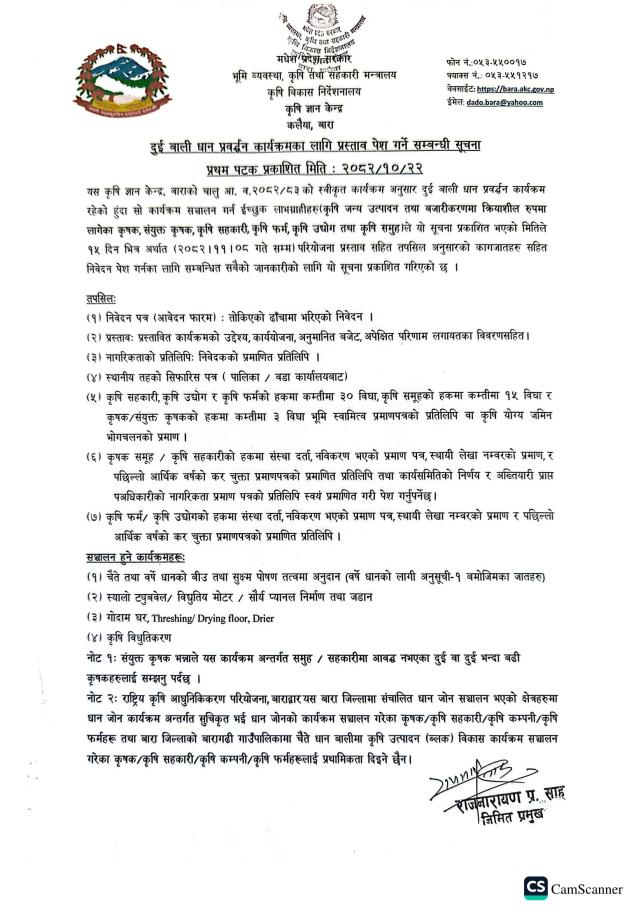 दुई बाली धान प्रवर्द्धन कार्यक्रमका लागि प्रस्ताव पेश गर्ने सम्बन्धी कृषि ज्ञान केन्द्र कलैया, बाराको सुचना । प्रथम पटक प्रकाशित मिति : २०८२/१०/२२ गते
