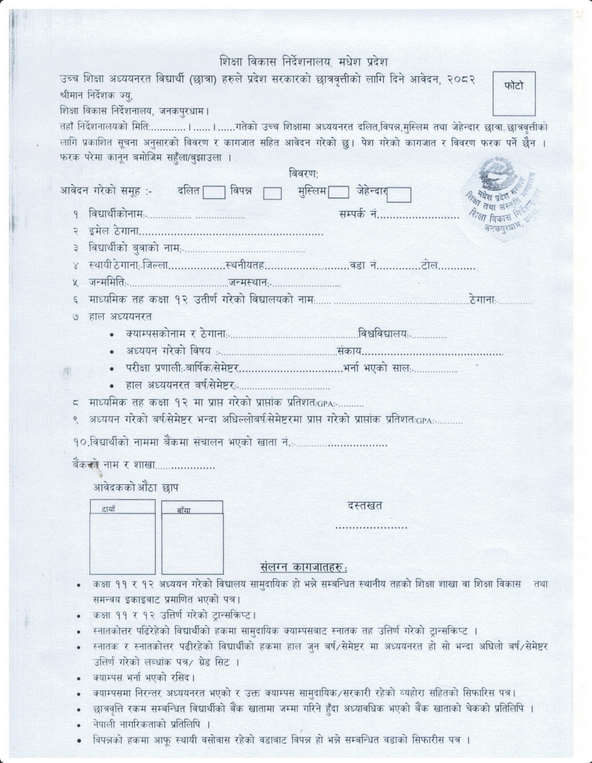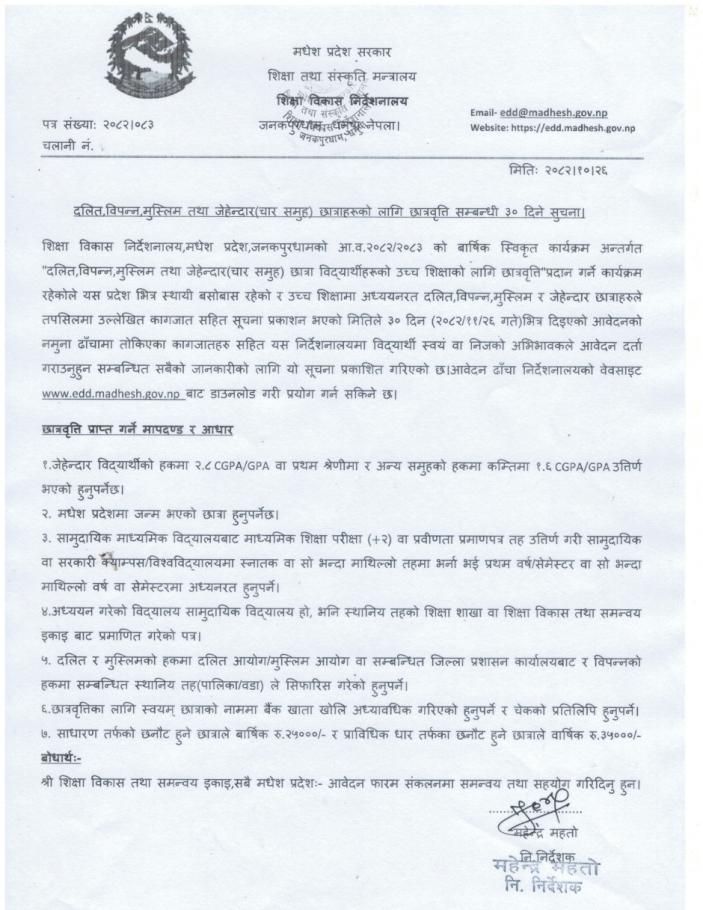 Home » दलित, विपन्न, मुस्लिम तथा जेहेन्दार (चार समूह) छात्राहरुको लागि छात्रवृत्ति आह्वान सम्बन्धी शिक्षा विकास निर्देशनालय मधेश प्रदेशको ३० दिने सूचना । श्री सम्बन्धित सबै