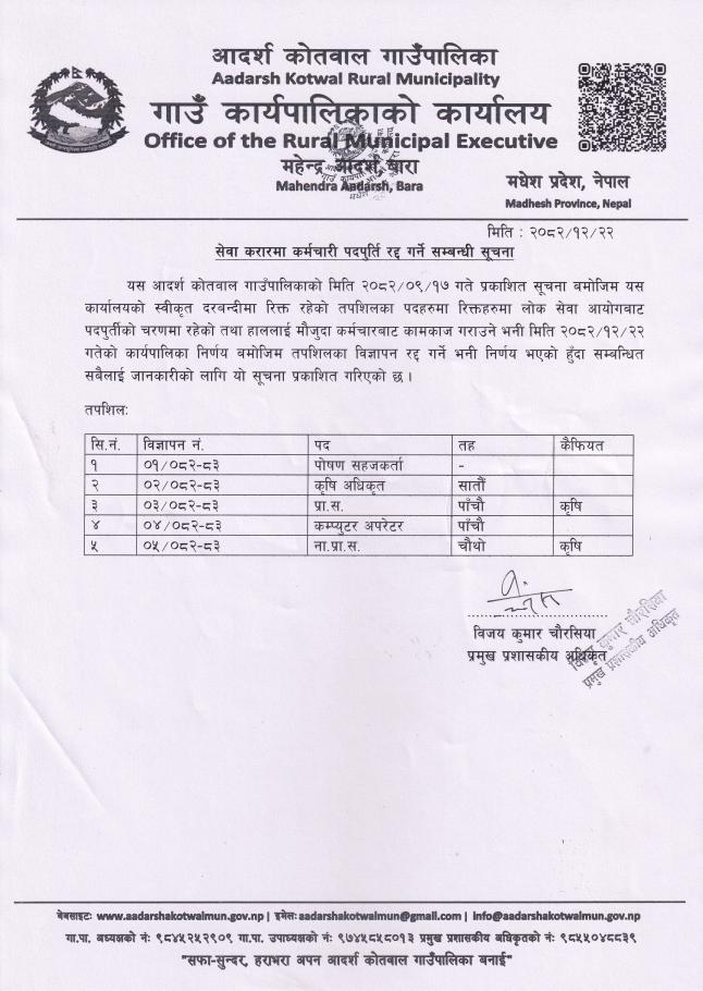 » सेवा करारमा कर्मचारी पदपुर्ति रद्द गर्ने सम्बन्धी सूचना । श्री सरोकारवालाहरु सबै