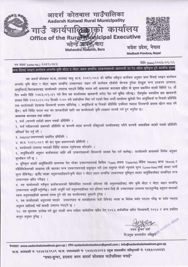 साना सिंचाई प्रबर्द्धन कार्यक्रम अन्तर्गत कृषि मोटर र मोटर जडान सम्बन्धी उपकरणहरूको खामबन्दी दर रेट सहित सुचिकृत हुने सम्बन्धी सूचना । श्री सम्बन्धित सबै - सूचना प्रकाशित मितिः २०८३/०१/१६ गते